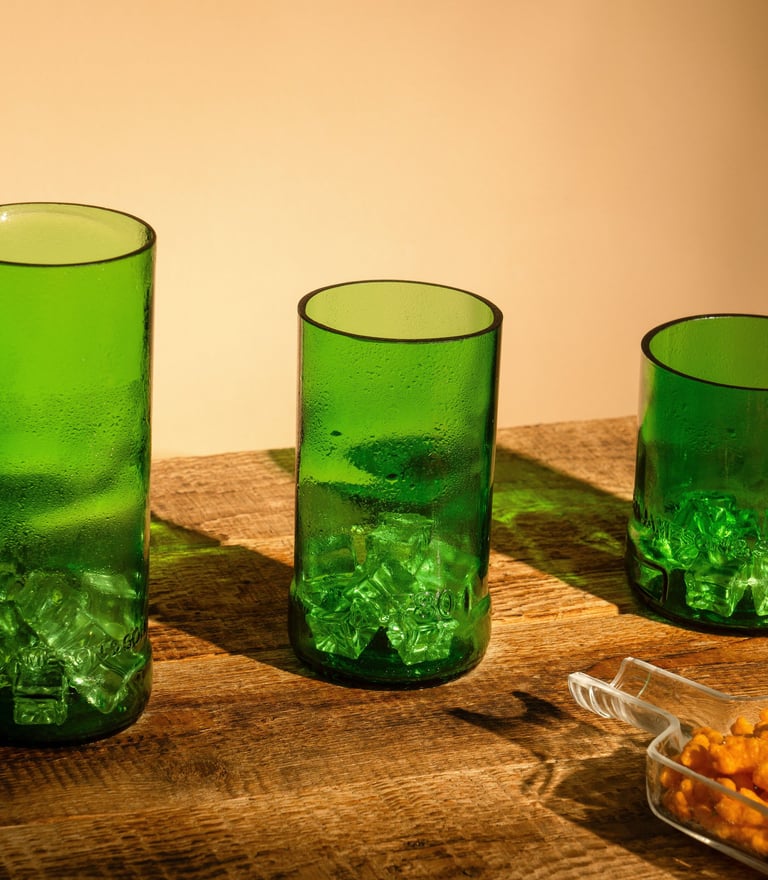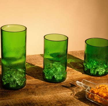Surenkame tuščius butelius iš vietinių kavinių, barų ir artimų draugų. Šiuos butelius perdirbame į stiklines, lėkšteles ir bei kitus gaminius. Taip prisidedame prie aplinkosaugos ir tvarios vartojimo kultūros. Mūsų tikslas yra sumažinti šiukšlių kiekį ir pailginti butelių gyvenimo ciklą. Pasitikėkite mumis ir kartu prisidėkime prie švaresnės aplinkos ir tvarios ateities.